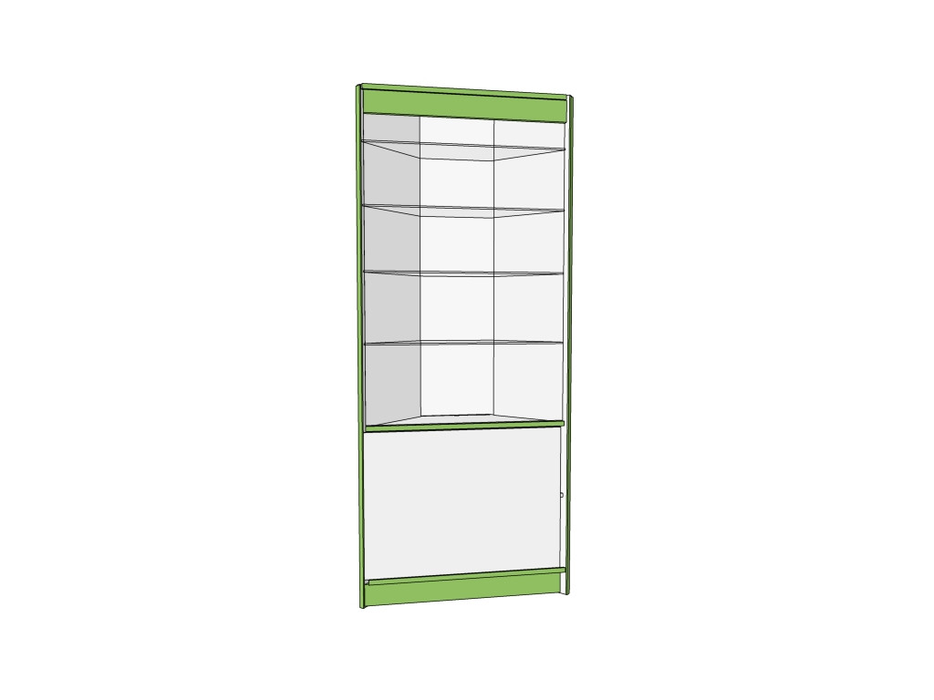 | Материал - каркас ЛДСП 16мм белое, кромка ПВХ 2мм в тон. Декоративный козырек и цоколь h80мм цвет? ЛДСП. Нижняя тумба h 600мм с дверями, внутри одна полка. Верхний шкаф - фасадное стекло - 5мм, полки стекло 6мм шлифованное - 4шт. |